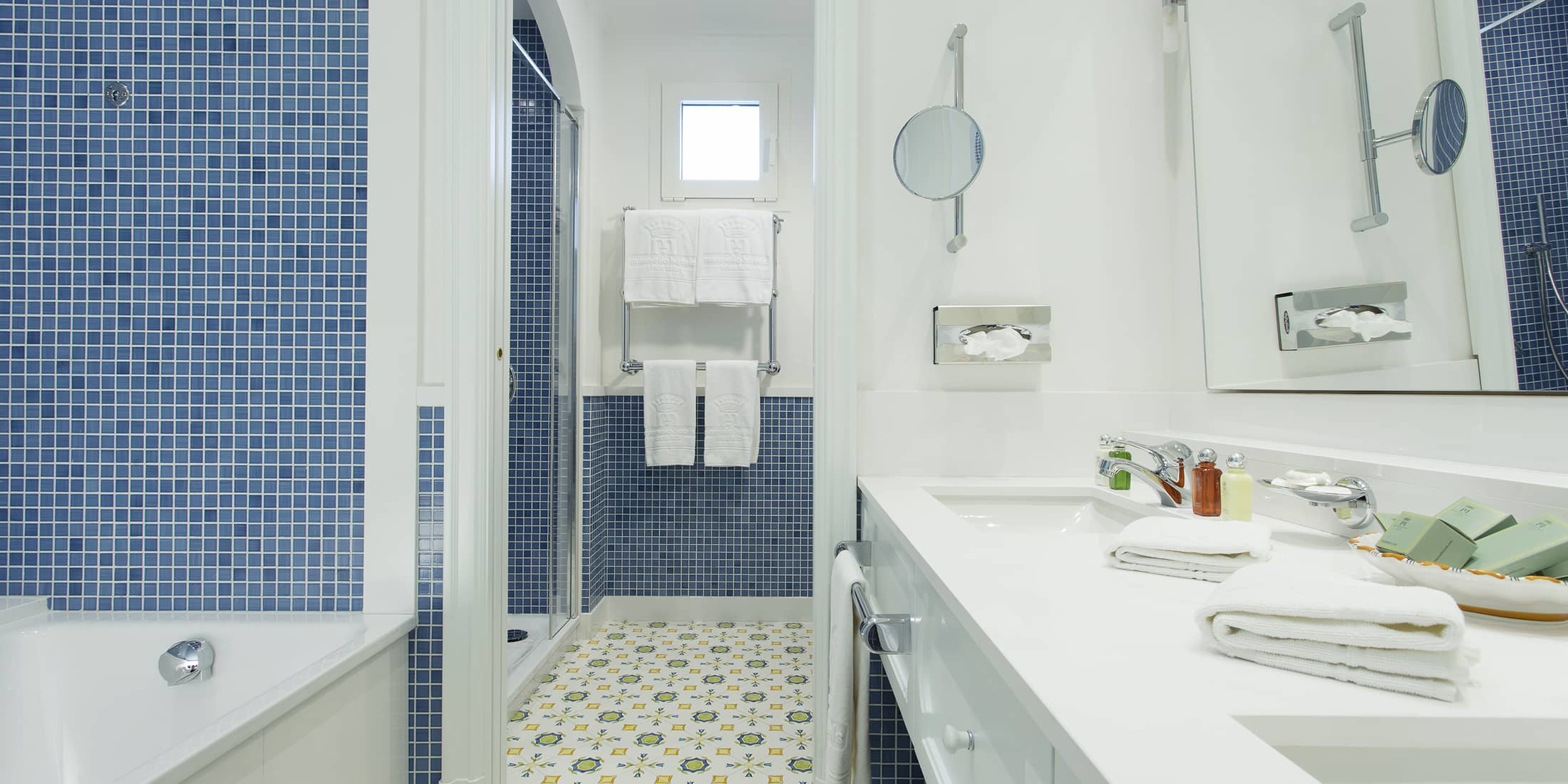 Les salles de bains, décorées de majolique précieuse décorée à la main et d'un dessus en marbre italien avec double vasque, donnent un charme unique à la pièce. Elles sont équipées d'une baignoire jacuzzi et d'une grande douche avec pomme de douche effet pluie, d'un téléphone, d'un sèche-cheveux, d'un miroir de maquillage, d'articles de toilette VIP, de chaussons et d'un peignoir.